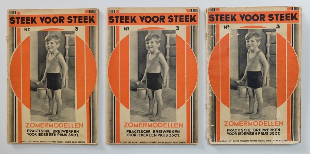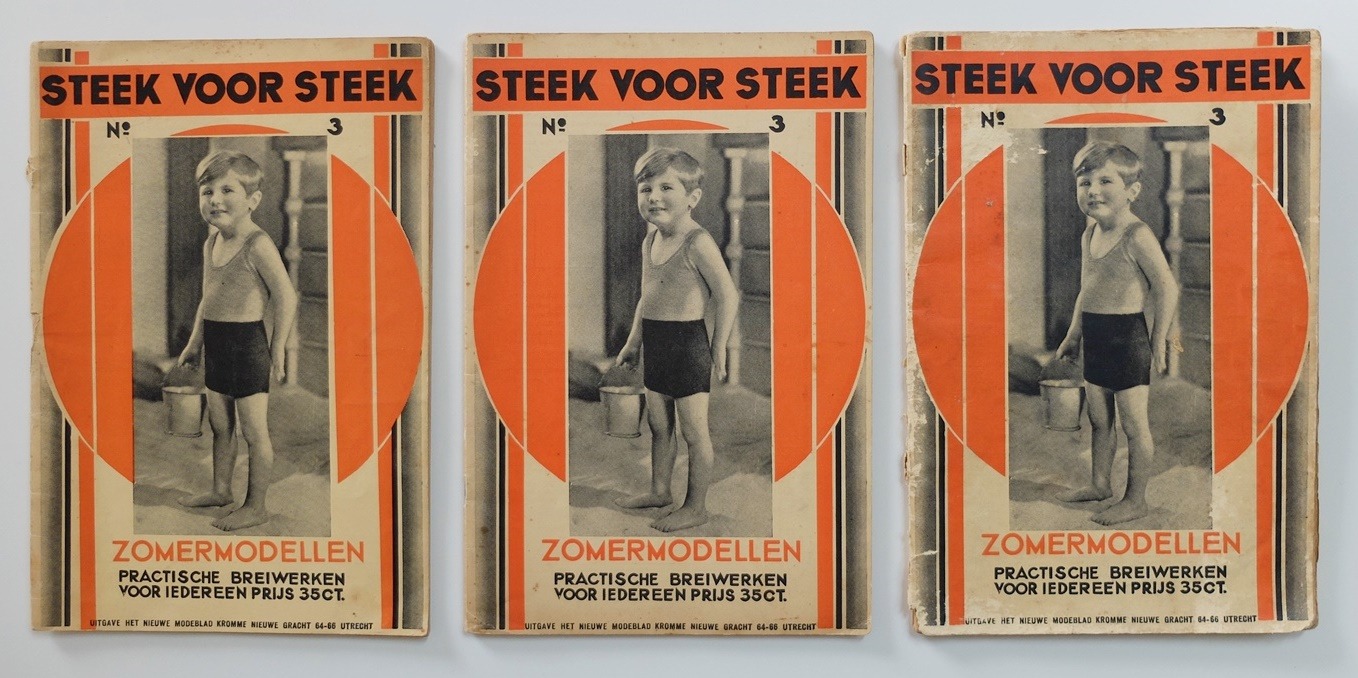 Tussen oude familiefoto’s vind je soms foto’s van onze ouders of grootouders in gebreid badpak aan het strand. Daar kun je dan om lachen of je kunt er verbaasd over zijn, maar dan is het goed om te weten dat iederéén er tachtig of honderd jaar geleden zo bijliep. Badmode werd gebreid! En eigenlijk stond dat nog helemaal niet zo gek. In deze oude Steek voor Steek-boekjes vind je de patronen om die keurig gebreide badpakken te maken. Ook andere mooie zomermodellen staan er in beschreven. De foto’s in dit boekje zijn heel mooi en ik laat er wel acht zien in m’n shop.