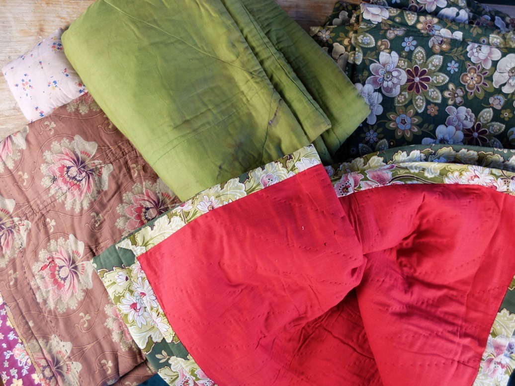 Ineens kwam ik op de gedachte dat ik ook nog een stapel stokoude dekens heb. In tijden van armoede was het vroeger gebruikelijk om een deken meerdere malen te verstellen door er gewoon weer een nieuw stofje overheen te naaien. Zo’n