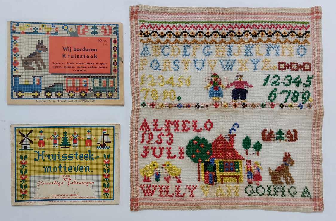 In Almelo, in 1953, en in Heemstede, in 1957, werd door twee meisjes een merklapje afgerond. Ze waren waarschijnlijk acht jaar. Vlak voor pasen was het lapje bijna vol genoeg om het af te ronden. Ze mochten nog wat figuurtjes uitkiezen uit de gangbare schoolboekjes van toen: Wij borduren Kruissteek, Kruissteek-motieven, en Vroolijke Kruissteekmotieven. Ik had die boekjes wel eens doorgebladerd en dat deed ik nu nog eens, nu ik deze merklapjes zag. Ik bladerde net zo lang tot ik die dansende haasjes zag! Drie vrolijke haasjes rond een mandje gekleurde eieren. Een vrolijke boel, net als het hele merklapje in de vrolijke kleuren!