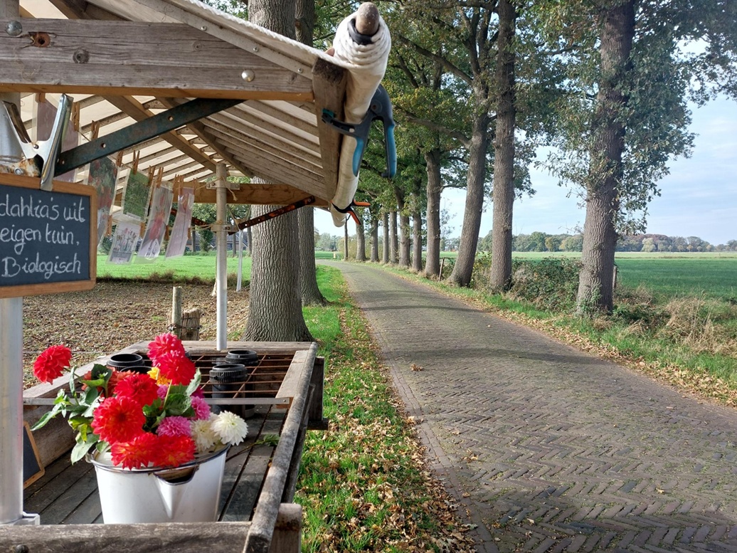 Terwijl ik dit schrijf, krijg ik een appje van de Dahlia-boerderij, want we hadden hen ook even geappt omdat er een telefoonnummer bij was vermeld. Even bedanken voor de bloemen en zeggen hoe fijn het is dat dit zo kan. Je ziet het hier wel vaker: groente en fruit en bloemen langs de weg, met een geldkistje of een briefje met betalingslink. Dat is ook een kwestie van vertrouwen en dat is er hier nog volop. Het is een mooie illustratie van wat ik wil overbrengen met dit blogje: Er is zò veel moois en goeds in deze regio, en eigenlijk in alle landelijke gebieden! De deskundigheid om het land te bewerken, en de saamhorigheid en medemenselijkheid van vroeger zijn hier niet verdwenen. De goedheid ligt hier bij wijze van spreken gewoon op straat…..