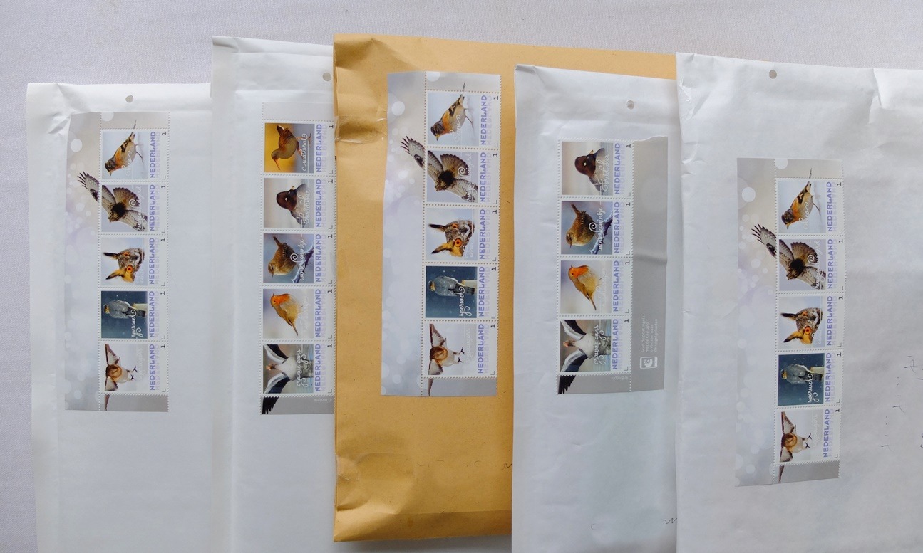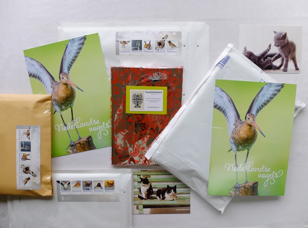 Maar ik denk dat ik nu m’n lesje wel geleerd heb (na al die aanmaningskaarten): voortaan ga ik de zijflapjes van de grotere enveloppen dichtplakken met plakband. Dat staat minder mooi, maar gaat mij hopelijk wat vervelende aanmaningskaarten besparen. Overbodig plakband had ik liever willen vermijden, want ik hou er juist van als een brief met een bestelling er mooi uitziet. Soms krijg ik reacties  dat de verpakking en de postzegels gewaardeerd worden. “Het voelde als een kadootje”, schreef laatst iemand. Ik sluit ook af en toe wat extra’s bij, zoals een paar poezenkaarten of een vogelmapje. Maar dat doe ik alleen als de envelop daardoor niet te zwaar wordt. Ik moet me wel aan de post-regels houden dus.