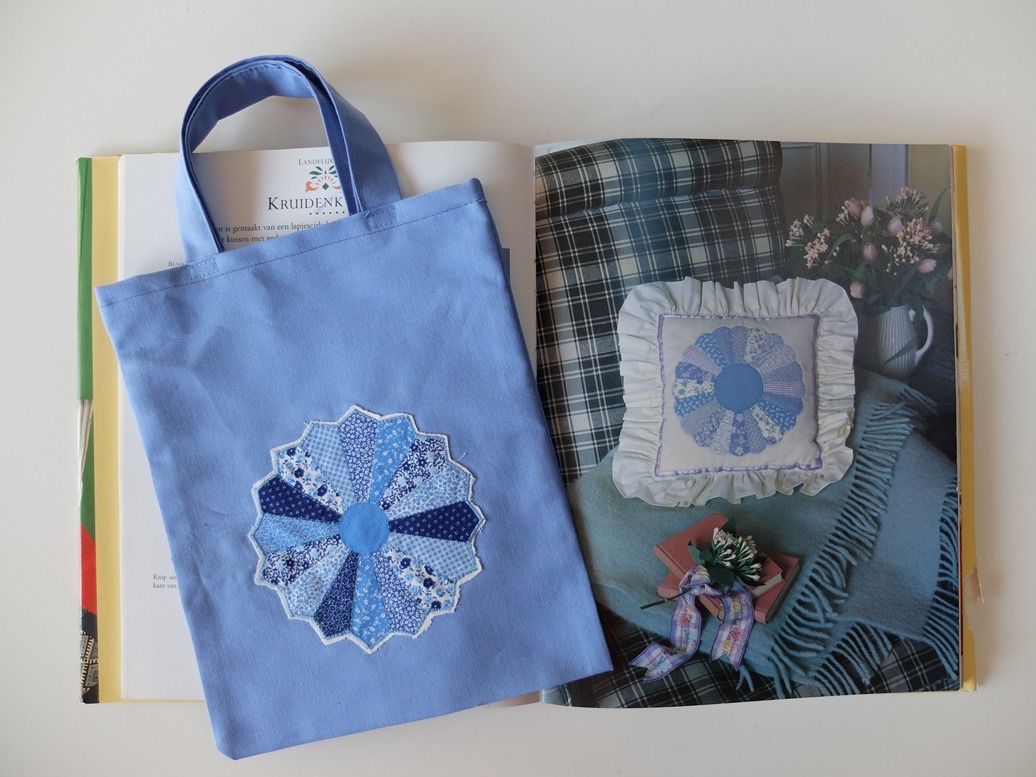 bekende manieren samengebracht en het is een plezier om door te bladeren. Je kunt je laten inspireren door de mooie foto’s en de vele technieken. In m’n shop plaatste ik een aantal foto’s om een indruk te geven. Bij het doorbladeren kwam ik ook een foto tegen van een bekend Dresden-plate-motief waar ik nou net gister zelf mee bezig was geweest. Ik maakte nog een tasje met deze applicatie erop.