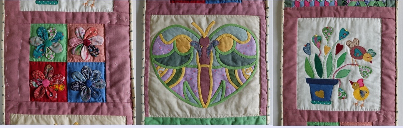 Een pronkrol van patchwork: die zie je niet zo vaak! Ik nam hem vandaag mee naar een plekje waar ik hem aan een hek kon hangen. Het is een soort langgerekt patchwork-plaatjes-plakkaat.