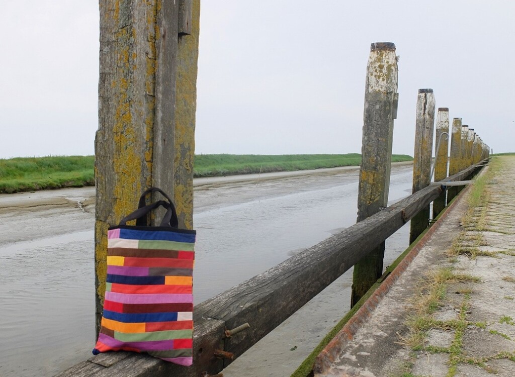 Aan het uiterste noorden van de provincie Groningen ligt Noordpolderzijl. Hier kun je wijd uitkijken over het wad en de kwelders. Bij helder weer kun je aan de horizon Schiermonnikoog, Rottumeroog, Ruttumerplaat en Borkum zien liggen. Maar jammer genoeg was het nu niet helder. Dus ik liep de dijk af en ging verpozen bij de palen. Decor voor mijn oudste patchworktas.