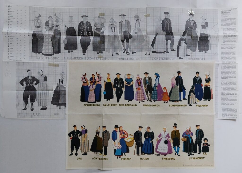 Het jaartal waarin iets werd uitgegeven is ook altijd wel interessant, want het toont de interesse voor een bepaald onderwerp in een bepaalde periode. In 1971 gaf tijdschrift Margriet een patroon uit van twaalf streekdrachten en dat sprak veel mensen aan. Mijn grootmoeder heeft het ook nog geborduurd. Opvallend is dat zo’n patroon ook heel lang in de herinnering blijft hangen, want nog veel later zijn er dan borduursters die hiernaar op zoek gaan. Ik heb al wel eens eerder over patroon en poster geblogd, en nu nog eens om te laten zien, en nu dan allebei samen en dat heb ik niet vaak. Poster en patroon kunnen beide besteld worden.