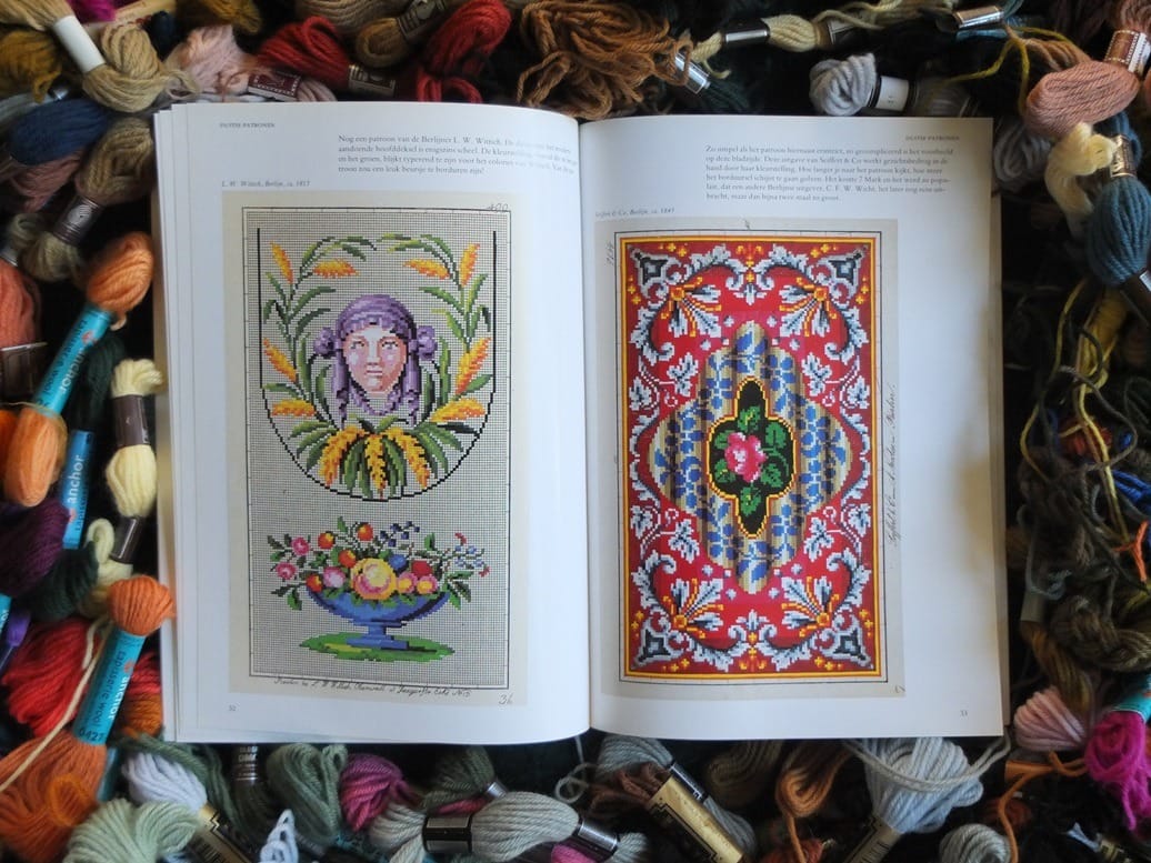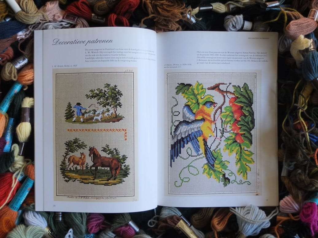 De meeste patronen werden vroeger los verkocht en zijn afkomstig uit Duitsland, Oostenrijk, Frankrijk en Nederland. Het zijn typische – ‘gezellig, huiselijk’ – biedermeier-tafereeltjes. Bijvoorbeeld een fruitschaal, een stoere bergbeklimmer met panorama, een grootvader met dochtertje op schoot, boerderij-stillevens, bloemboeketten en ook dieren, paardenrennen, de jaargetijden en het alfabet. Bij elk patroon geeft de schrijfster interessante wetenswaardigheden over de achtergronden, het jaar van uitgave, de populariteit toen, enz.