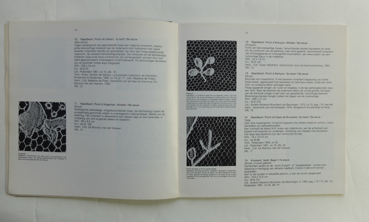 In 1961 werd in drie zalen van het Museum Boymans-van Beuningen een verzameling klos- en naaldkanten tentoongesteld, welke voornamelijk bestond in het bruikleen van De Monchy-van der Hoeven. Dit langdurig bruikleen is in de loop der jaren door schenking eigendom geworden van het museum. Naar aanleiding van de genoemde expositie verscheen een boekje, een soort platenboekje, waarin 41 stukken kant waren afgebeeld en beschreven. Dit boekje is sedert lange tijd uitverkocht. Aanleiding tot een heruitgave is wederom een tentoonstelling van ons kantbezit, in 1978; nu echter een keuze uit de collectie en bovendien niet in eigen huis, maar in het Amsterdamse museum Willet-Holthuysen.” (uit de inleiding)