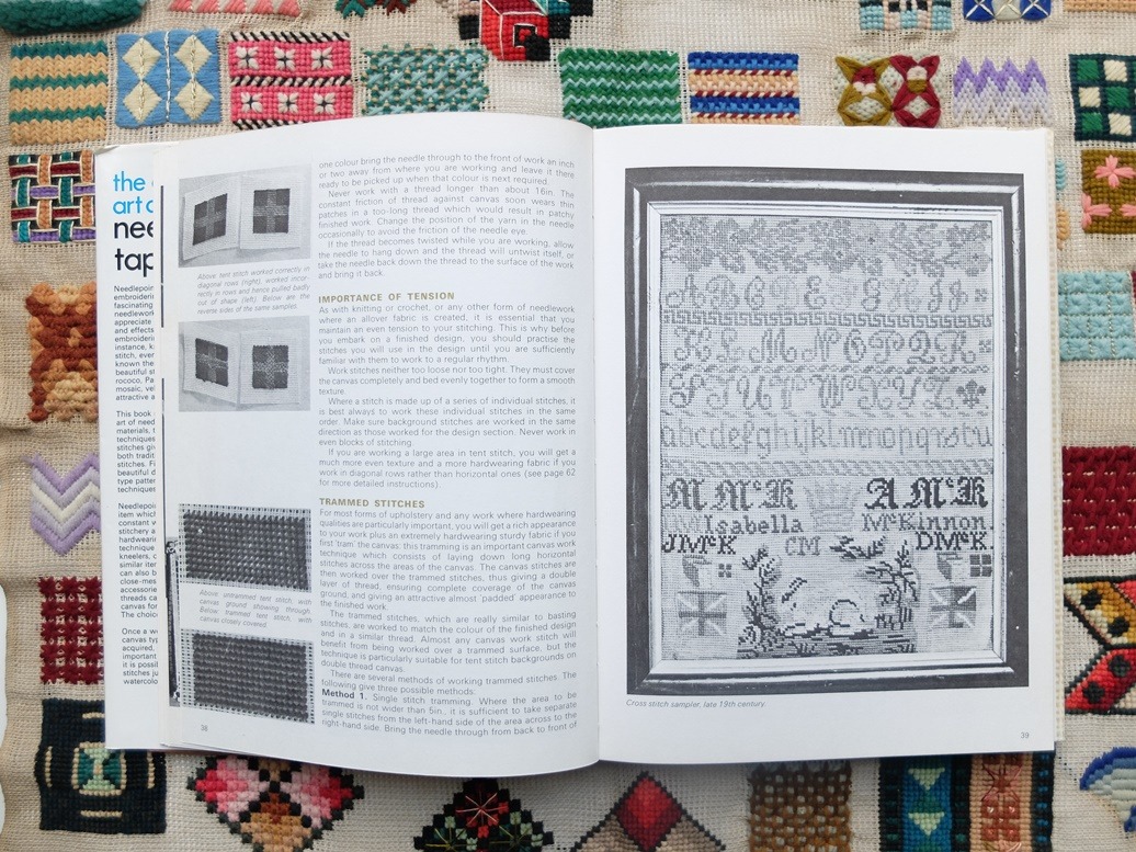 “Needlepoint – which is the craft of embroidering on a canvas ground – is a fascinating and rewarding form of needlework. Few people in fact really appreciate the enourmous variety of stitches and effects which can be produced by embroidering on canvas.” (uit de inleiding)