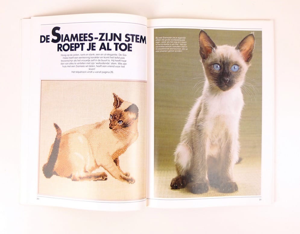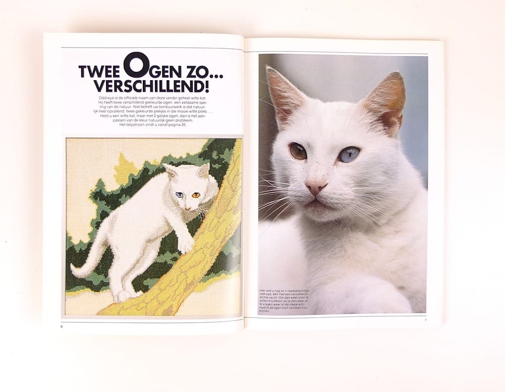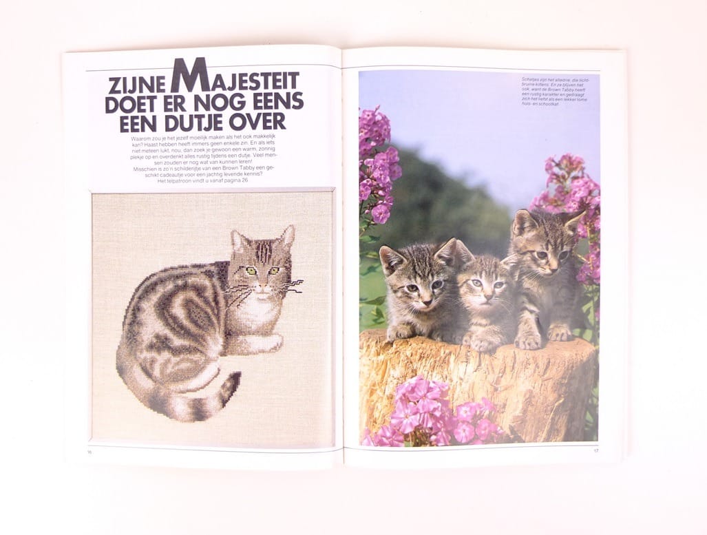 11 verschillende poezen: kleurenfoto, beschrijving, kruissteekafbeelding, en duidelijk kruissteekpatroon.