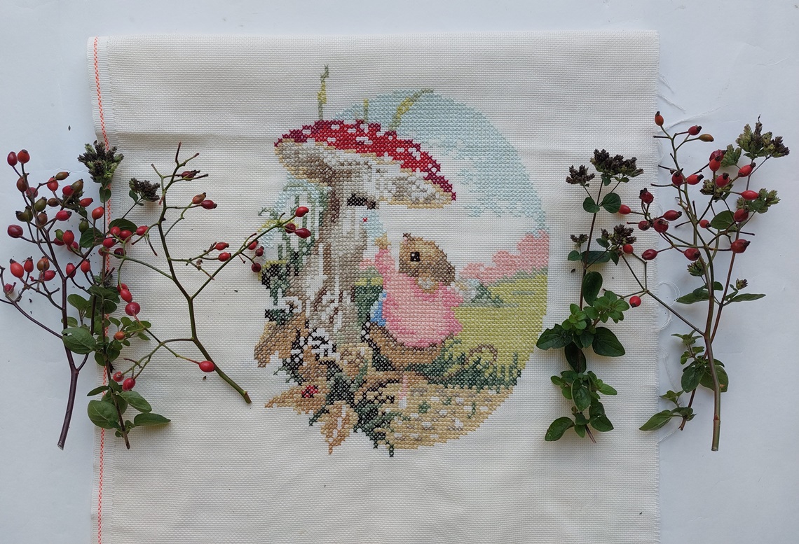 Het borduurwerk is gedaan op een grote lap aida-stof. Er is nog veel ruimte aan de bovenkant over,
