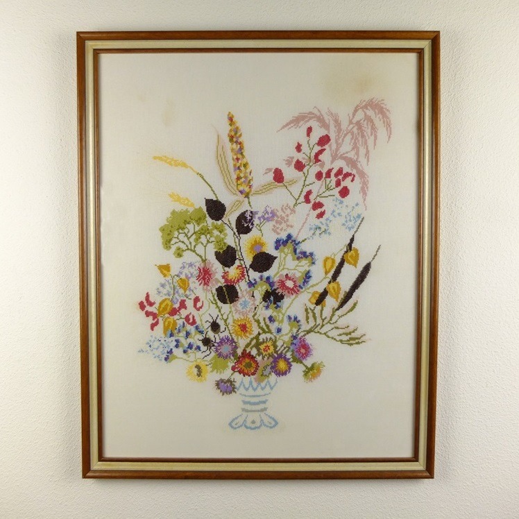 Er is geborduurd op een ondergrond van bruin handwerklinnen.