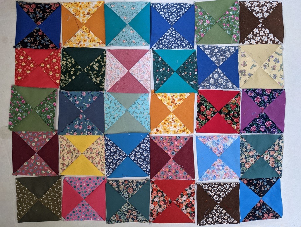 Eindelijk haalde ik mijn oude lapjes weer eens tevoorschijn, wat ik al een hele tijd van plan was. Het leek me leuk om nog eens een zandloperquiltje te maken. Ik gebruikte alleen bloemetjesstofjes uit de vorige eeuw. Voordat ik de blokjes aan elkaar naai, laat ik ze eerst een tijdje liggen op een wit karton. Zo is  het makkelijk om te zien welke stukjes nog omgedraaid moeten worden, of verwisseld moeten worden, of vervangen moeten worden. En om te bedenken dat er nog heel wat blokjes bij moeten komen.