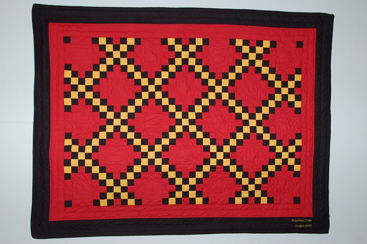 De Double Irisch Chain is een eenvoudig patroon met dambordeffect, dat twee blokken in beslag neemt. Het komt voor in enkele, dubbele en drievoudige variaties. Het worddt vaak toegepast als kleurige schakelkettingen op een witte of crèmekleurige ondergrond, maar het kan dus ook in kleur. Het ontwerp voor dit quiltje is ontleend aan een Mennonieten-quilt uit Pennsylvania van rond 1900. Door de warme en krachtige kleuren heeft het een visuele spanning en levendigheid niet vaak werd aangetroffen bij dit gewoonlijk ingetogen patroon.