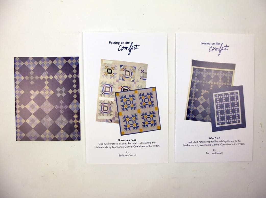 Twee pakketjes van patronen van relief quiltsDe ‘Relief quilts’ (waar ik eerder) over schreef zijn de patchwork-dekens die in de Tweede Wereldoorlog zijn gebruikt voor vluchtelingen. Een grote partij quilts werd gedoneerd door Mennonieten in Noord Amerika. Na de oorlog werden ze opgeborgen, later ontdekt, en nu staan ze volop in de belangstelling. Van deze quilt werden kaarten gemaakt en die zijn in het Groninger dorpje Warffum te koop. Ik kocht Drie oude Amish quilts uit collectie passing on the comfortzo’n kaart daarvan maakte ik deze foto. De originele quilt hangt ook in het museum en ik vond het bijzonder om die te zien. Maar er is nog meer wat ik hierbij wil vertellen: van sommige quilts werden ook patroon-pakketjes gemaakt. Ook die waren te koop. Omdat ik het leuk vond om bij thuiskomst wat in m’n winkeltje te zetten, kocht ik er twee. En ook om op deze manier deze relief-quilts onder de aandacht te brengen. Verdere informatie over de patroon-pakketjes in mijn shop.