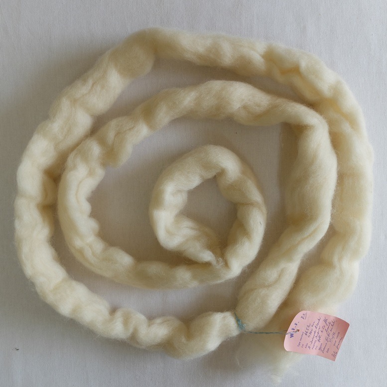 een streng ongesponnen wol uit Nieuw Zeeland. Er zit nog een kaartje aan en daarop staat de datum van 1966. En nu is het 2016. Die streng is dus vijftig jaar oud. Ongelooflijk: ze voelt zò zacht aan alsof ze nèt van een lammetje komt. En het weegt ook haast niks: lichtgewicht wol van waarschijnlijk heel goede kwaliteit. Deze wol heeft dus èn een hele lange weg afgelegd om hier in Nederland op een webshop te belanden, èn een lange tijd overbrugd. Waarschijnlijk jarenlang verborgen in een kast bewaard gebleven voordat ze misschien binnenkort op iemands spinnewiel belandt.