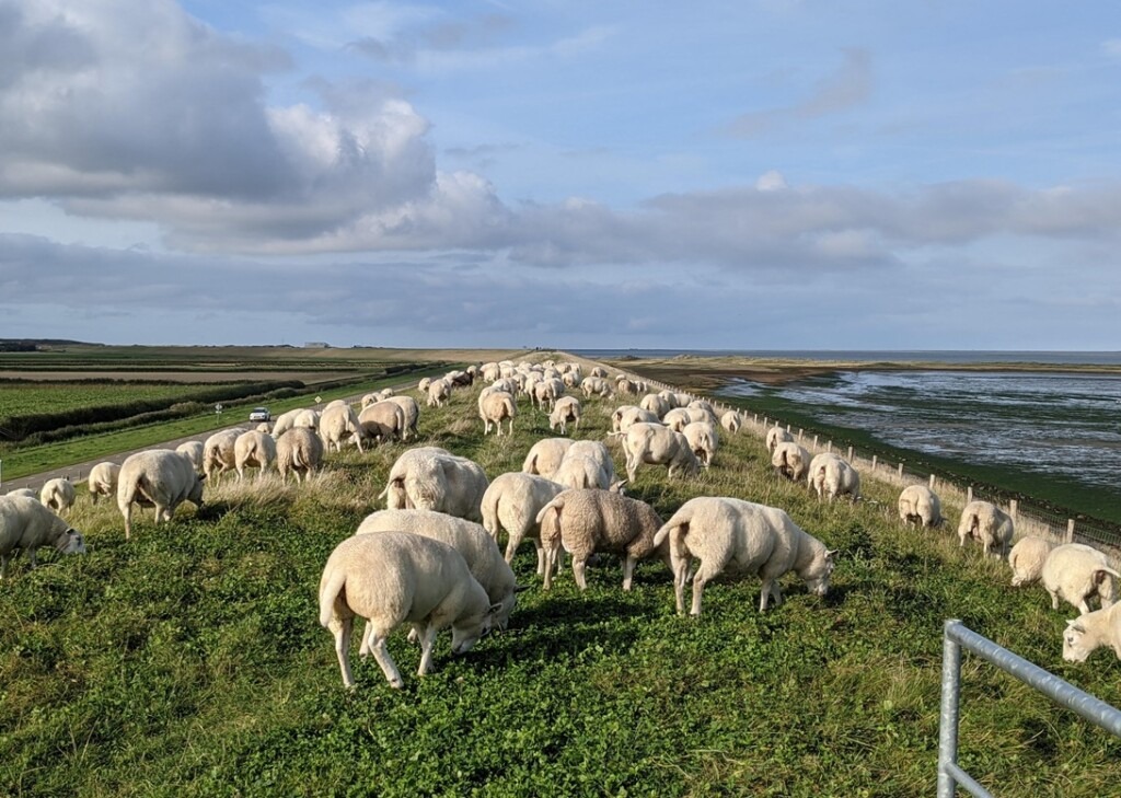 We waren precies bovenop een dijktrap, die ons van een parkeerplaats naar uitzicht-over-het-wad bracht. Ik zag dat iemand beide hekken langs de trap wagenwijd opendeed. De hekken piepten en even vroeg ik me af: “Wat gebeurt hier?” Toen zag ik: “o, de boer!” Hij floot heel hard en ogenblikkelijk kwamen de schapen in beweging. Het ging allemaal zò snel! Ik moest nu snel beslissen of ik zou blijven staan op mijn plekje middenop de dijk, en misschien was dat nòg leuker geweest. Maar bij al die aanstormende dieren deed ik onwillekeurig toch een paar passen de dijktrap af en kon toen nog net een foto maken van de rennende schapen. Niet een foto van dat ze vlak langs me liepen, want daarvoor was ik te verbaasd en ging het te snel. Wel weer van dat ze aan het andere stuk van de weiland waren. Ze begonnen dirèct te grazen en heel die wilde galop was gelijk weer voorbij. Wat was het leuk om dit zo van dichtbij te zien!