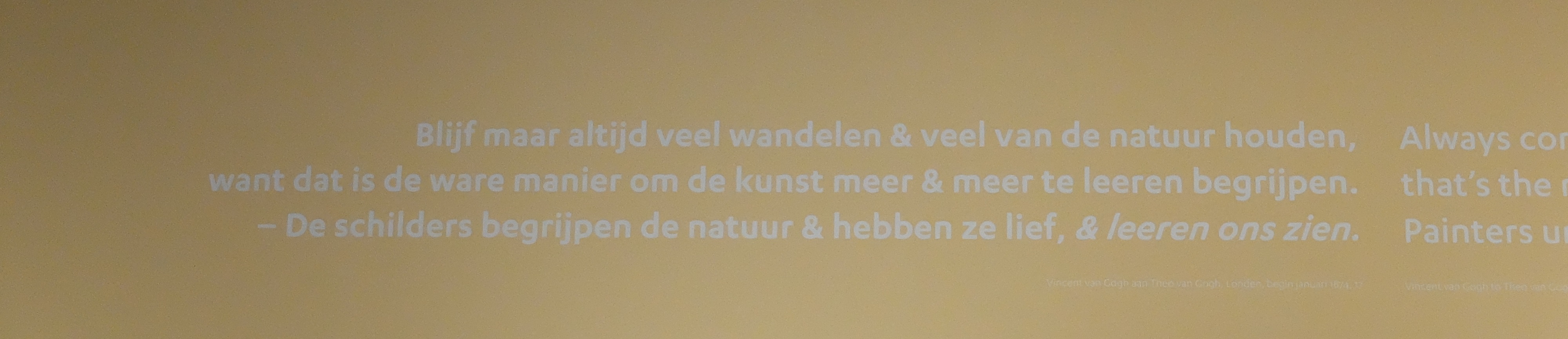 Maar ik wil graag positief eindigen (en porto-verhogingen aankondigen is niet positief). Het afgelopen jaar had het Kröller Möller museum een grote overzichtstentoonstelling waarbij heel veel informatie op de muren was geprojecteerd. Ook een paar mooie one-liners, citaten uit de brieven van Van Gogh. Ik fotografeerde zo’n citaat en die geef ik hieronder nog eens weer. (Dit citaat liet ik eerder zien, in een blogje over een eerder bezoek aan dit museum).
