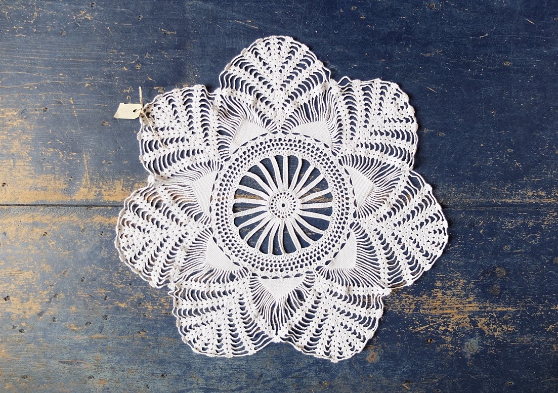 Ik was in een oude antiekboerderij en kocht daar dit mooie witte kleedje voor m’n shop. Ik let er altijd op of ze mooi gemaakt zijn, en dat is dit witte schatje zeker wel!