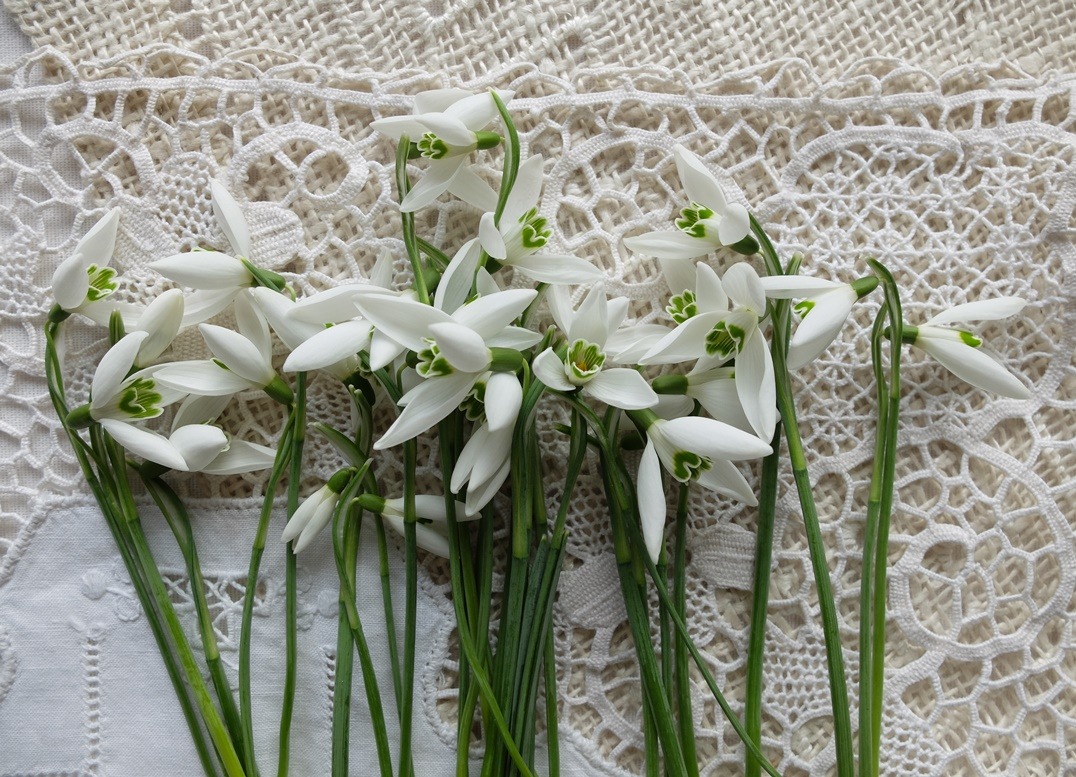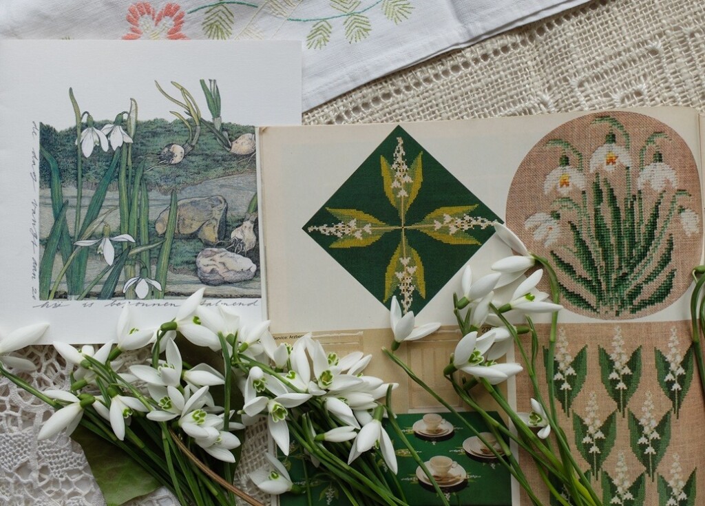 1. Op de bovenste foto zijn het zo te zien niet allemaal sneeuwklokjes. Er zijn ook een paar patronen bij van lelietjes van dalen, ook voorjaarsbloemen. Bij ons in het bos zijn ze hier en daar nog in het wild te vinden, maar bij Stinze tuinen onder bomen komen ze ook veel voor. Ze ruiken heerlijk (patroon in het midden en rechtsonder). De meegekregen echte sneeuwklokjes zijn ook erg mooi, het zijn “ouderwetse”, dubbele sneeuwklokjes, zeer gewild bij tuinliefhebbers!