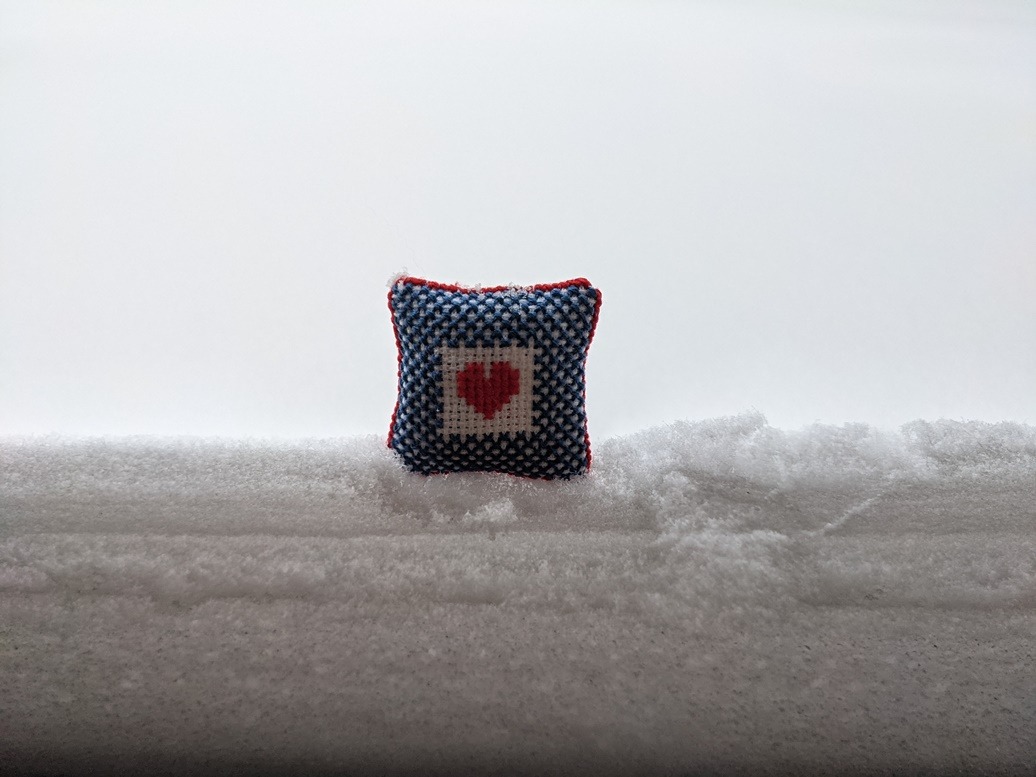 Zondagochtend. Alles is nog stil. Heel voorzichtig schuif ik het raam open zodat het sneeuwmuurtje wat daar tegenaan is geblazen blijft staan. Het bovenste topje is maar een paar millimeter dik en daar balanceer ik een klein kussentje op. Het is nog niet zo aantrekkelijk om er nu al op uit te trekken en andere foto’s te maken. Misschien straks. Twee kleine kussentjes om jullie te groeten op deze besneeuwde zondagmorgen. Het bovenste kussentje is ‘dubbelzijdig’ geborduurd, door iemand anders. De onderste maakte ik vorig jaar zelf. Iets kleins, temidden van een grote witte wereld.