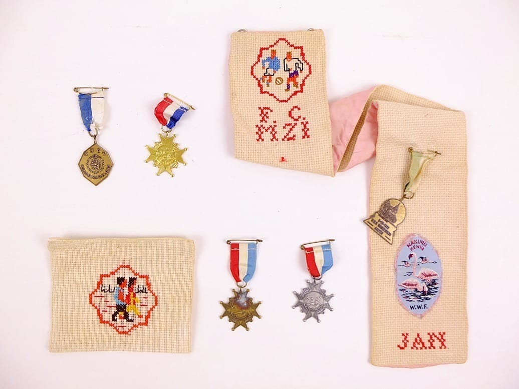 Nederland kon gisteren meegenieten van de medailles die voor het schaatsen werden behaald en vandaag worden uitgereikt. Gelijk op de eerste dag van de Olympische Spelen al drie medailles wat een beeld opleverde van drie Oranje schaatsers op een rij! Ook de koning stond erbij en keek ernaar en was zichtbaar blij. Al vanaf Olympische tijden worden winnaars beloond met goud, zilver of brons. Dat is voor ‘gewone mensen’ natuurlijk niet weggelegd en daarom is het is ook al heel lang gewoonte om daar een soort kopieën van te maken. Ik herinnerde me het geborduurde aandenken wat Jan’s moeder lang geleden in de zestiger jaren maakte voor haar zoon. Alles wat geborduurd is, bewaarde ik en nu heb ik zojuist dit sportieve borduurwerk weer opgezocht om het hier te laten zien. De oude medailles (veelal aan het eind van de zwemvierdaagse verkregen) heb ik er even afgehaald, nadat ze er bijna een halve eeuw op hebben gezeten. En verder wens ik sportieve kijkers vandaag veel Olympisch kijkplezier toe! Want het kijken naar hoe die drie oranje schaatsers gehuldigd worden is natuurlijk prachtig.