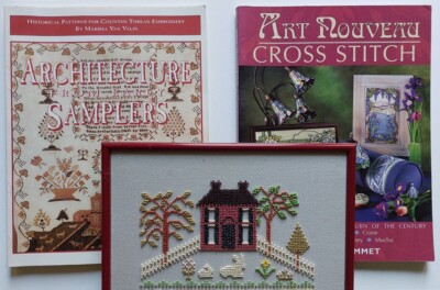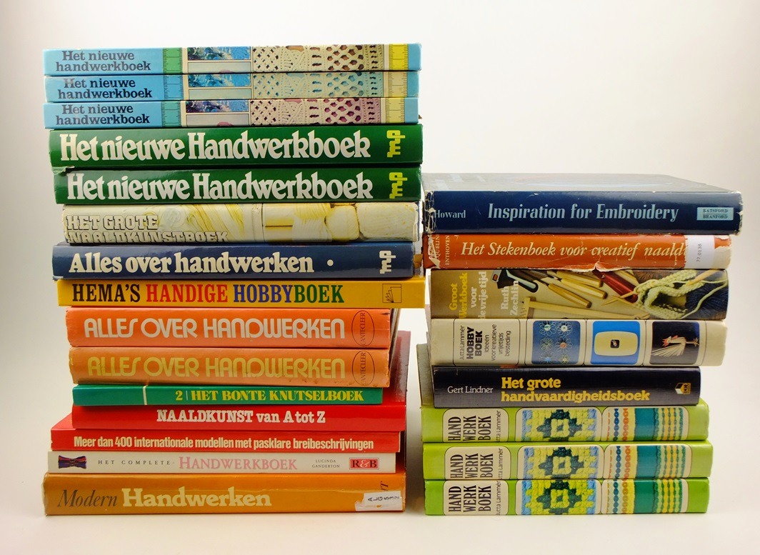 “Alles over handwerken”, “Het complete handwerkboek”, “Het nieuwe handwerkboek” en “Het grote naaldkunstboek”. Dat zijn mooie titels! Opvallend in deze stapel is het vele oranje en groen: dat waren geliefde kleuren in de zeventiger jaren. Deze dikke handwerkboeken komen bijna allemaal uit de vòrige opleving van handwerk, en dat was in de zeventiger en tachtiger jaren. Wat is er toèn ook veel gehaakt en gebreid! Maar ook heel veel andere technieken worden in deze boeken beschreven, zoals Macramé, Frivolité, Kantklosen, Weven, Batik, Guimpen, Tapisserie, Stofdruk, Punniken en nog veel meer. Veel van deze technieken zijn nu ook weer populair aan het worden en er verschijnen weer nieuwe boeken. Toch zijn die oude boeken ook nog heel interessant! Ik heb ze altijd mooi gevonden en verzamelde ze, maar toen ik vorig jaar begon met boeken verkopen, aarzelde ik wel of ik die dikke boeken ook in m’n shop wilde hebben. Ze moeten namelijk bijna allemaal als postpakket verstuurd worden. Tot nu toe is gebleken dat er wel vraag naar is. En het is natuurlijk extra leuk als ik ze straks kan meenemen naar een Kerstinstuif in Vaassen, waar veel borduursters komen. Als je van plan bent om daar te komen, en je ziet nu al een boek wat je graag wilt hebben, dan kan ik het voor je reserveren en sparen we portokosten uit. Voor alle anderen: sommige van deze boeken had ik al in m’n shop (even naar beneden scrollen of de zoek-functie gebruiken); en heel veel andere boeken heb ik de afgelopen dagen toegevoegd. Wie weet zit er wat tussen! “Alles over handwerken” vind ik zelf het mooiste boek, maar ook de andere zijn erg leuk om door te bladeren!