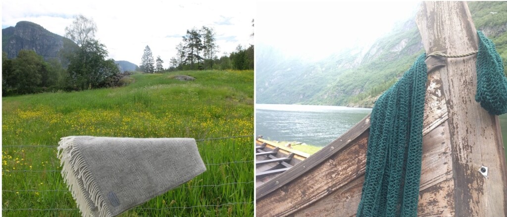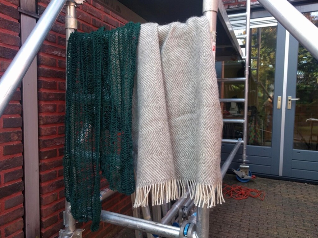 De schilder die ons huis verft ontmoetten we voor het eerst tijdens een vakantie in Noorwegen. In dat koude noorden guimpte ik een groene sjaal (die ik nog steeds gebruik) en kocht ik een wollen plaid (die ik nog steeds in de kamer heb liggen). Twee mooie Noorwegen-aandenkens die ik nu over de steiger hing.