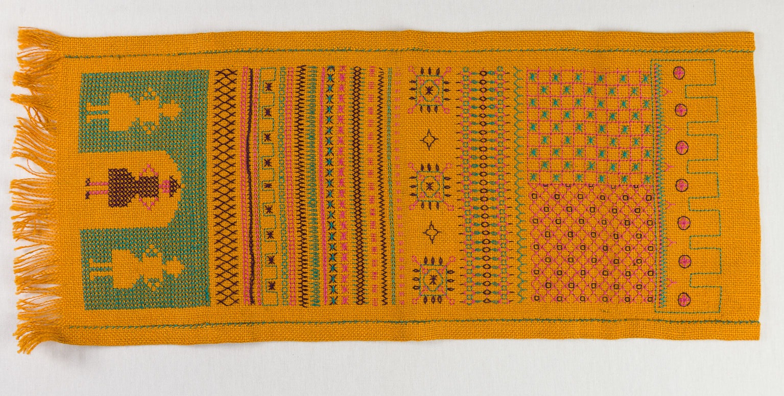 Op het ingeweven-rode-randjes-stramien werden in de vorige eeuw heel veel merklapjes gemaakt, maar ook stekenlapjes zoals deze. Ga ik later nog meer van laten zien en over vertellen. We zijn pas aan het begin van het jaar, niet alles tegelijk.