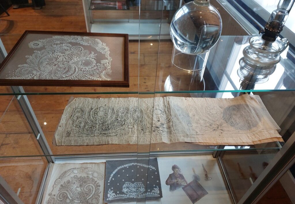 Hier stond ook een vitrine met patronen en ordinaal. Vele vrouwen hebben zo met zo’n dikbuikige waterfles bij het raam gezeten, urenlang werkend aan de kant.