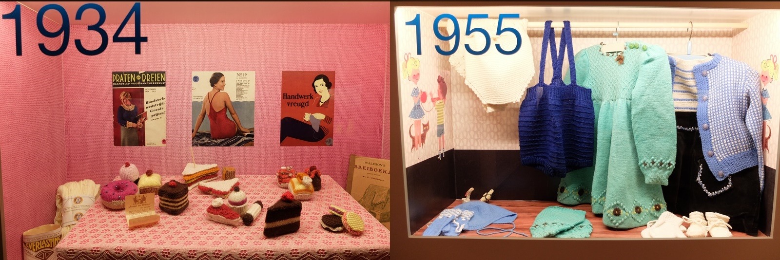 Breien is in 1934 inmiddels een hobby voor alle lagen van de bevolking geworden. En vrouwen breien ook gezellig samen. Dat wordt ook gezien door de garenfabriek ‘Everlasting”, want ze brengen een tijdschrift uit onder de titel: “Praten en Breien” (links in de vitrine). Het is het eerste echte breitijdschrift in Nederland.