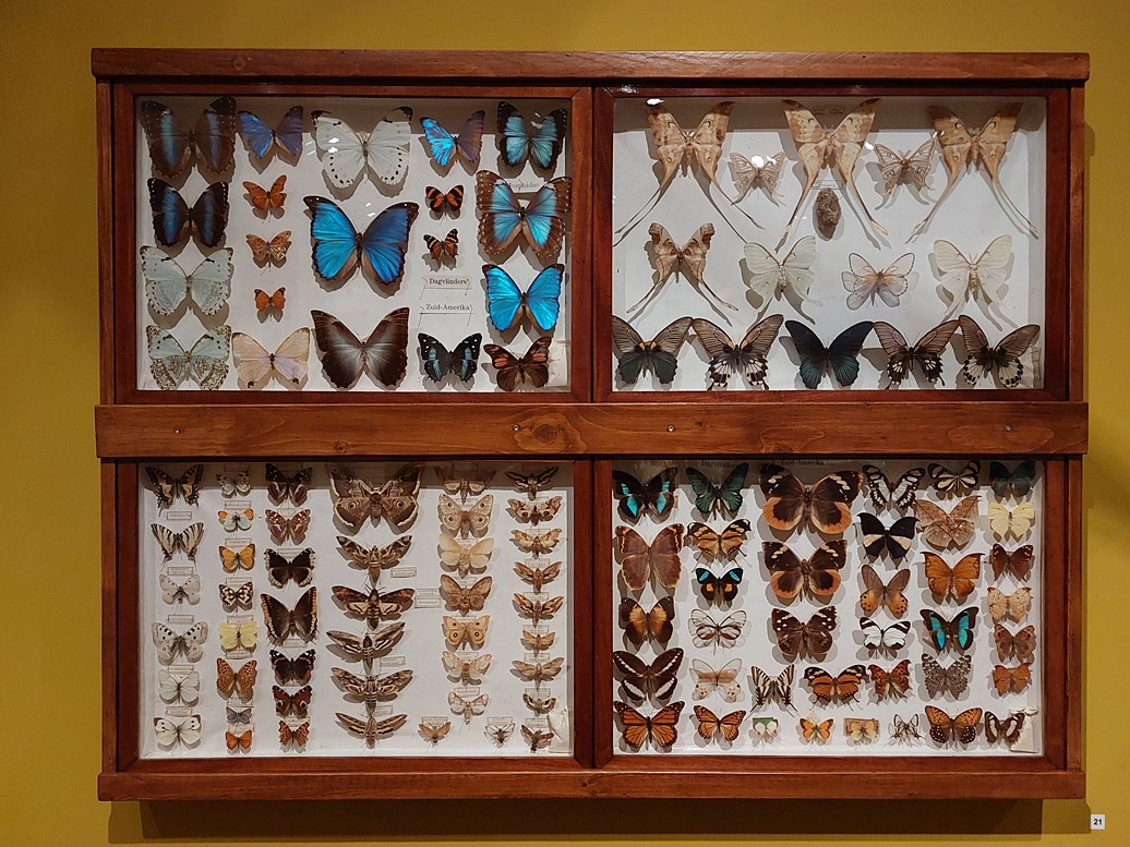 We kijken nu heel anders tegen die verzameldrift aan, waarbij er vaak geen oog was voor de lokale belangen van de gebieden waar al die dieren en voorwerpen uit werden geroofd. Een voorbeeld van hoe er nu meer aandacht is voor de positie van de mensen die vroeger werden overheerst, is het wandkleed wat hierboven te zien is. Ernaast ligt een boek van Maria Sybillan Merian, de vrouw die in de zeventiende eeuw naar Suriname reisde om de planten- en insectenwereld te bestuderen. Daar maakte ze prachtige tekeningen van die nu wereldberoemd zijn. Maar veel inheemse en tot slaaf gemaakte vrouwen hielpen haar en zij hebben géén erkenning of beloning gekregen. Het wandkleed, gemaakt door Patricia Kaersenhout, laat die vrouwen en de uitgewiste verhalen verschijnen in een palimpsest: het oude schemert door het nieuwe.