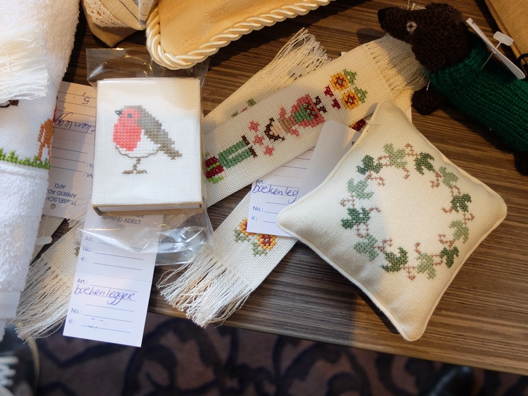opvallend veel jonge vrouwen die allerlei leuke luiermanden, knuffels, handdoekjes en mooi spulletjes kochten. “Maar je hebt toch al drie schorten?” hoorde ik een man tevergeefs tegen z’n vrouw zeggen. “Ja maar deze is zo mooi!” was haar antwoord, en het nieuwe schort bleef in haar mandje. Ook ving ik een aantal keer op dat vrouwen tegen elkaar zeiden dat ze cadeautjes aan het inslaan waren. Dat deed ik geloof ik ook. Zo’n schattig roodborstje, of zo’n mooi afgewerkte boekenlegger: er is altijd wel iets wat te mooi is om te laten liggen….