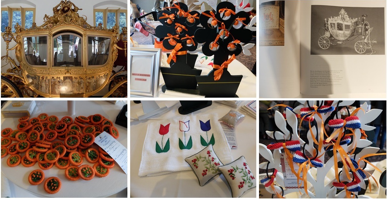 Er zijn 30 afdelingen in Nederland en die houden hun eigen verkoopdagen. Dus kijk op de website van Tesselschade om te weten of er nog iets in de buurt is. Bij het weggaan zag ik op een tafeltje een boek liggen over de vereniging en daar keek ik nog even in. Ik zag een foto van de Gouden Koets (die vorig jaar nog op paleis het Loo te zien was) en las dat de kussens van deze koets in 1998 door dames van Tesselschade waren geborduurd in petit point. De vereniging heeft altijd iets koninklijks gehad en heeft ook altijd adellijke associaties gehad. In Apeldoorn is dat wel heel goed merkbaar, met een verkoping zo vlak naast het paleis. Op de verkoping in april zijn ook altijd mooie oranje handwerkjes te koop, of geborduurde kroontjes. Het past gewoon prachtig in die koninklijke omgeving.
