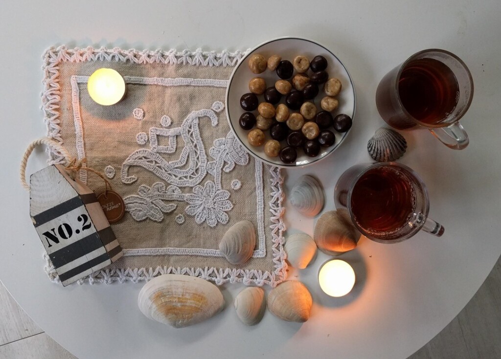 Het kleedje lag een paar dagen op een vakantie-tafeltje, voegde toe aan de sfeer, heeft nog veel meer decoratie-mogelijkheden maar het werd al schemerig en daarom blijft het bij deze foto. Thee met pepernoten en een kleedje na een lange wandeling, wat kun je dáár van genieten!