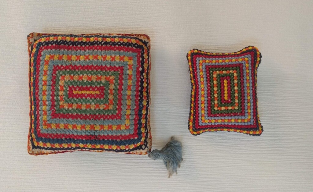 Een paar dagen geleden liet ik een paar kleine zelfgemaakte speldenkussentjes zien, waaronder een kleintje met kleurige randjes.