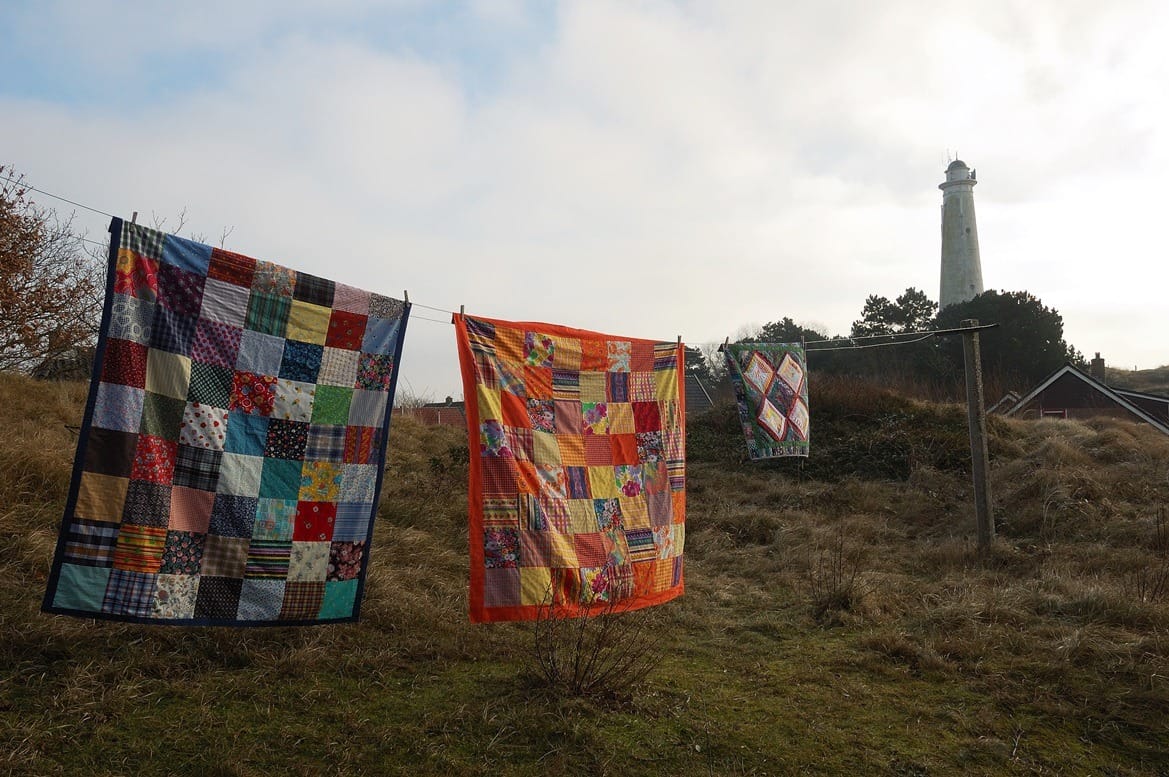 Op Schiermonnikoog neem je als toerist meestal géén auto mee naar het eiland. Alles wat je nodig hebt, moet je zelf kunnen sjouwen. Dus neem ik alleen dunne lappendekens mee, zonder tussenvulling. Dit is de foto die ik een paar jaar geleden daar maakte. Vrijstaand huisje, waslijn voor de deur, en dan óók nog eens met de vuurtoren op de achtergrond. Dat is helemáál het summum!