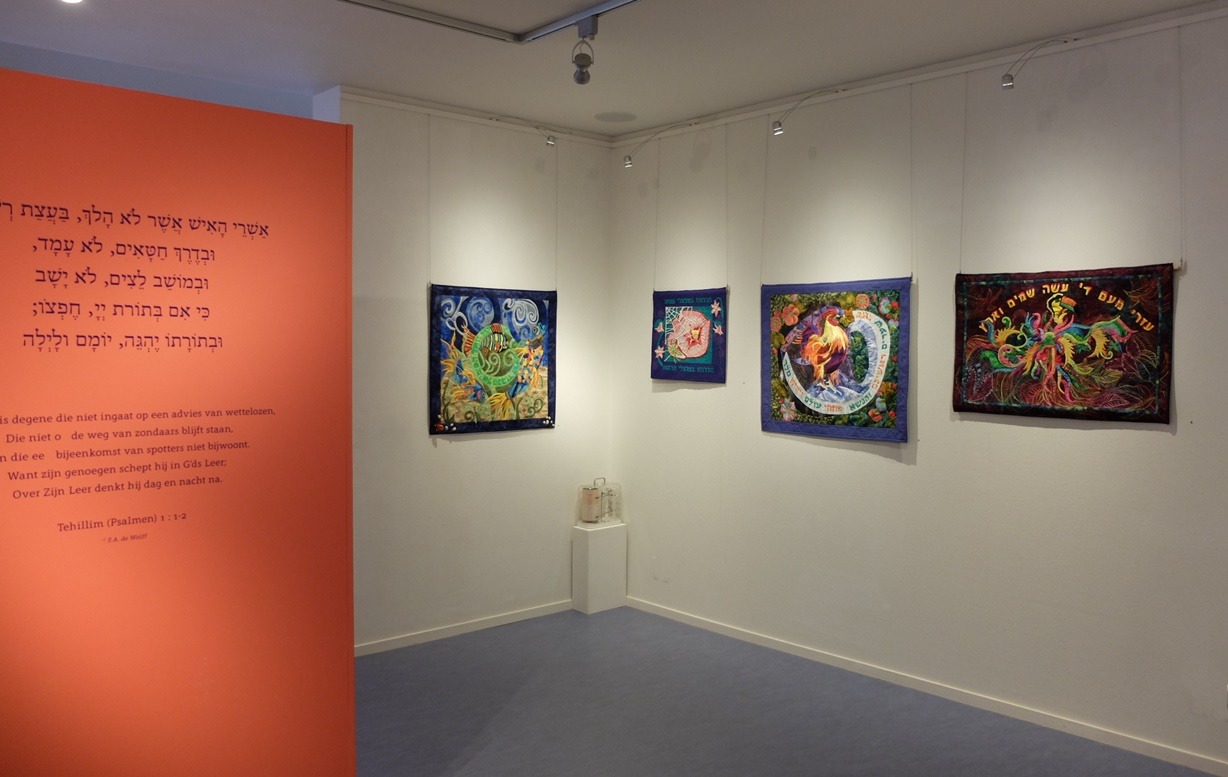Nog maar een paar dagen hangen de kleurrijke art-quilts van de joodse kunstenares Marlene Sanders in het Museum-Sjoel te Elburg. Iemand maakte me attent op deze tentoonstelling, en ik ging gauw nog even kijken. Het is de eerste keer dat zij in Nederland exposeerde. Haar textiel-expressies zijn geïnspireerd op markante momenten uit het heden en verleden van de oude joodse tradities, en op studie van de Thora.