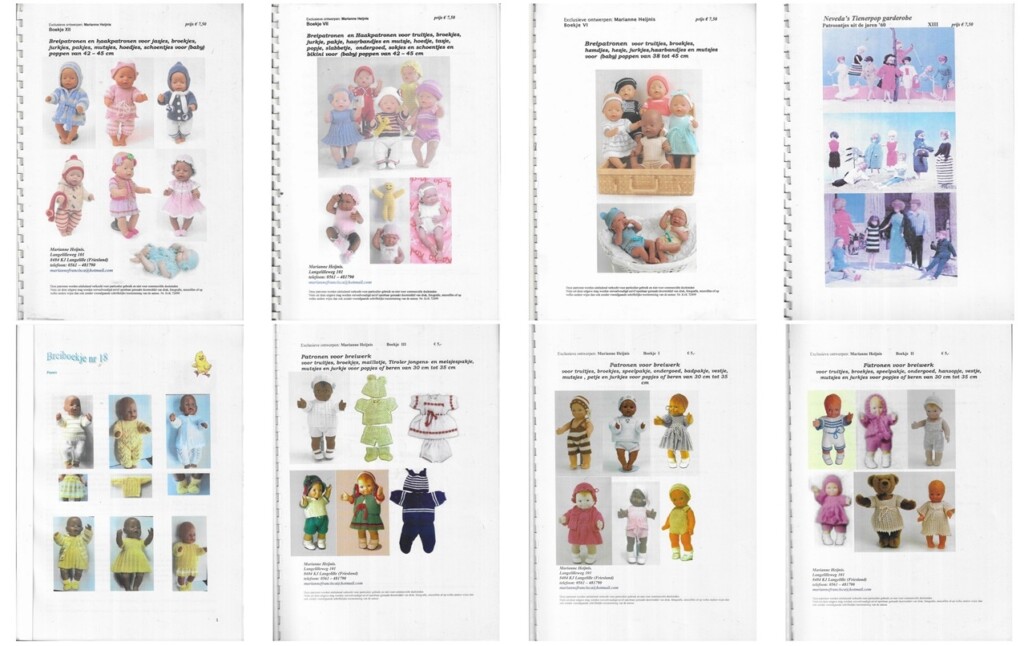Iemand verzamelde veel patronen voor poppekleertjes en breide alles na om te kijken of de patronen nog kloppen. Daarna schreef ze alles opnieuw uit, maakte mooie foto’s en gaf de patronen uit in eigen beheer. Ik schreef degene die dit zo mooi deed een mailtje met de vraag of ze hier nog voorraad van heeft. Maar waarschijnlijk is dat niet aangekomen, het is ook alweer een tijdje geleden dat dit werd uitgegeven.