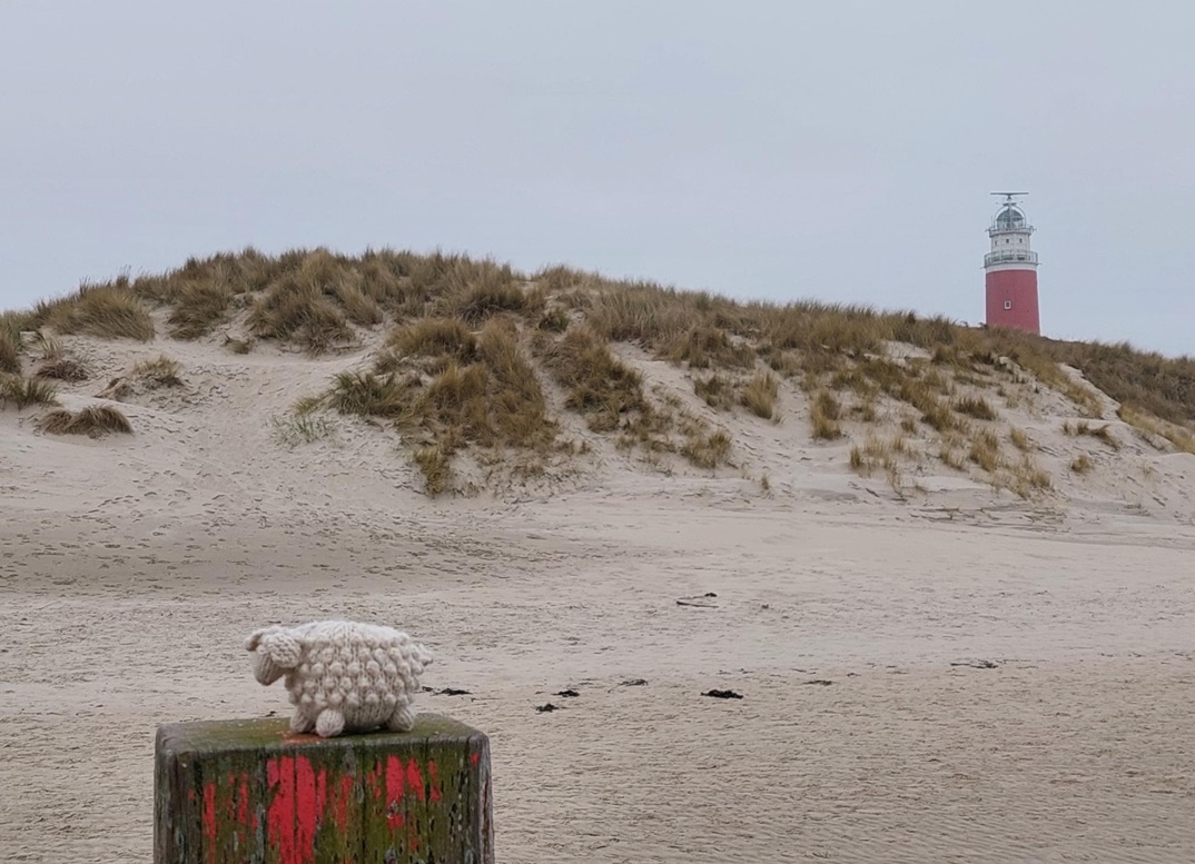 In één foto twee kenmerken van Texel: de rode vuurtoren en een schaapje.