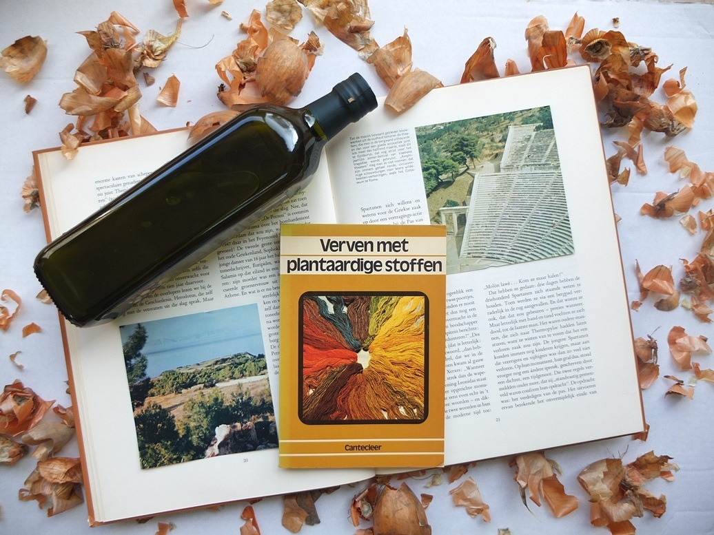 Dat was dertig jaar geleden. Later verhuisden we, en zij ging zelfs helemaal naar Griekenland. Daar heeft ze nu een boomgaard met olijven. Dat geeft natuurlijk ook goud-geel resultaat. We hadden ruim twintig jaar geen contact gehad. Toen dacht ik: Ik heb een blog die iedereen kan lezen, en waarom dan niet m’n oude vriendin? Dus mailde ik haar en haalde die herinnering op: “Weet je nog dat ik vroeger uienschillen voor je spaarde? Ik heb er nu een blogje over; wil je dat eens lezen?” Haar antwoord was: “Ik kom binnenkort naar Nederland, dan zal ik wat voor je meenemen!” En zo vond ik via m’n blog een vroegere vriendin weer terug. Ze kwam op bezoek en nam inderdaad wat voor me mee: haar oude boekje waar ze vroeger uit leerde om zelf te verven met plantaardige stoffen. Precies hetzelfde boekje als waar ik over had geblogd! En ook nog een boekje over weven. En ook nog een fles olijfolie van eigen produktie. Dat zijn van die momenten dat ik denk: Bloggen is superleuk! Ik krijg er niet alleen nieuwe contacten door, maar vind ook oude contacten weer terug!