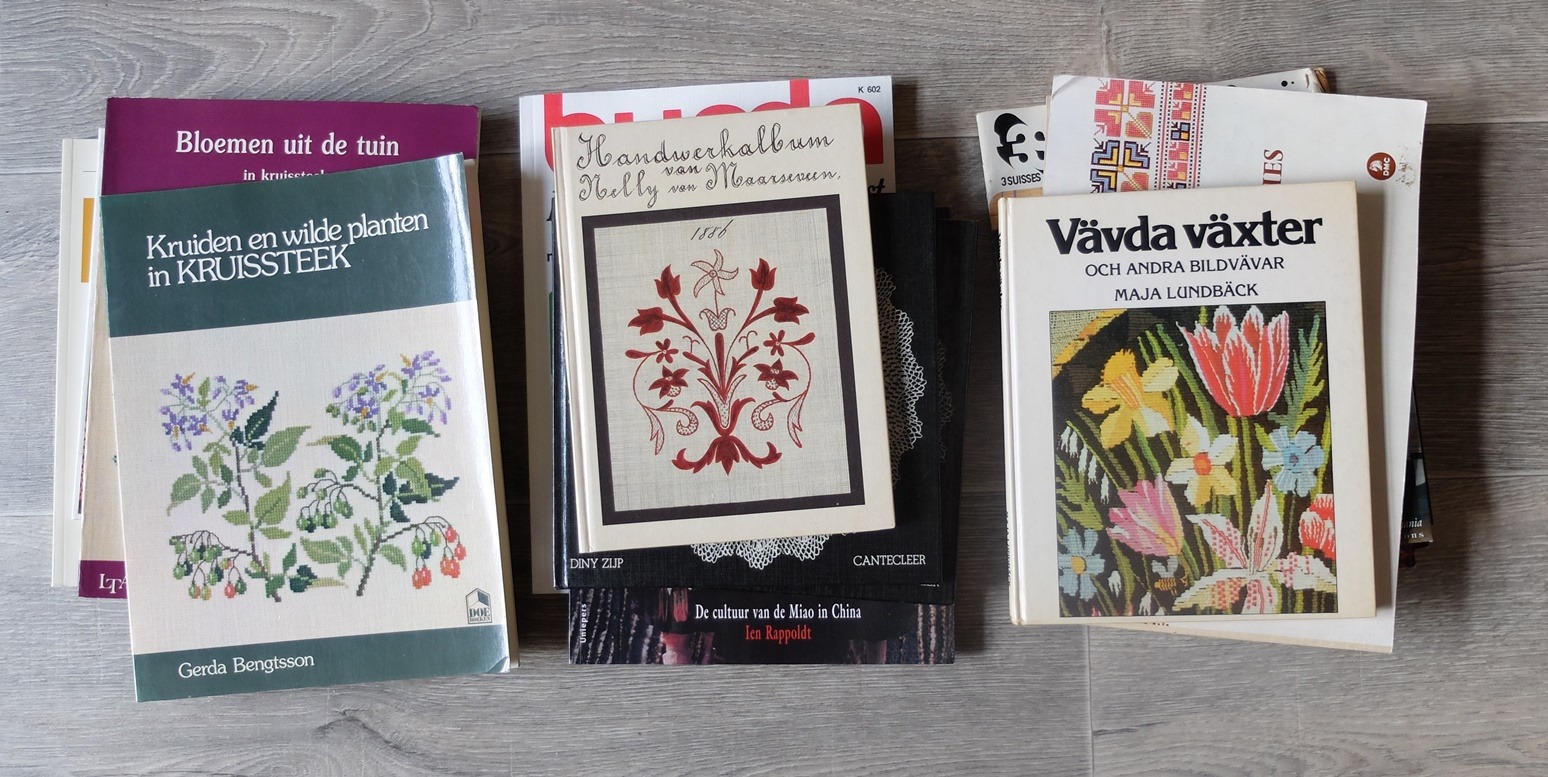 En ook bloemen zijn al eeuwenlang favoriet om weer te geven in kruissteek. Maar nu viel me juist iets op: ik had een paar stapeltjes boeken op de grond liggen, en bovenop ieder stapeltje lag een boek met een bloemen-compositie. Op de eerste stapel misschien wel het meest favoriete boek voor kruissteek-liefhebbers: Kruiden en wilde planten in Kruissteek. Daarnaast het handwerkalbum van Nelly van Maarseveen (nu weer geliefd omdat het net in tijdschrift Merkwaardig werd genoemd). Hierop zijn de bloemen in naaldkunst weergegeven. En daarnaast een leuk Zweeds boekje waarin de bloemen ingeweven zijn. Dat plaats ik dan nog net even in m’n shop, en daarna ga ik op vakantie. Volgende week ben ik er dus weer om wat op te sturen.