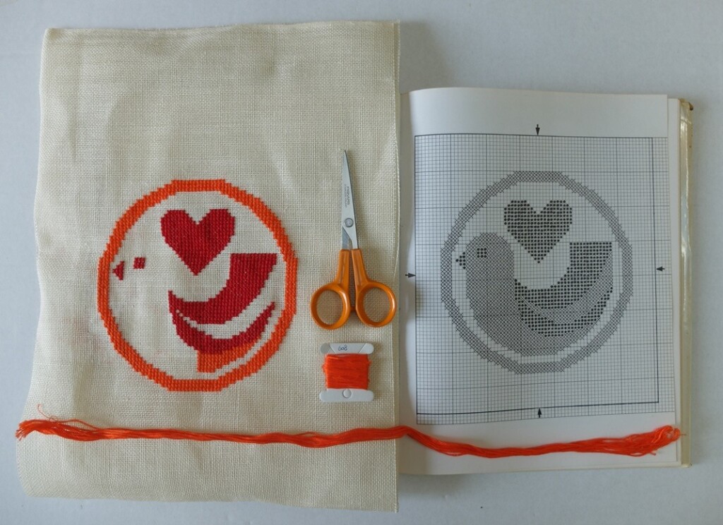 In een boek over Scandinavisch borduurwerk vond ik een vogeltje met hartje en dat wilde ik borduren. Een restje oranje op een kaartje van mezelf vul ik aan met een restje oranje van iemand anders, maar dat laatste is ook een ergernis. Want het garen is al in korte stukken geknipt en zo kom ik het wel vaker tegen. Vroeger waren handwerkjuffen heel streng in hun onderwijs naar hun leerlingen: Je mocht beslist geen lange draad gebruiken “want die raakt alleen maar in de knoop.” Talloze keren werd dat gezegd tegen beginnende borduursters, met als gevolg dat sommigen hun draden wel héél erg kort knipten. En dat deden ze dan hun hele verdere borduurleven, waarbij ze dus borduurden met hele korte draden. Ik vind dat helemaal niks. Met zo’n korte draad heb je nog maar nèt aangehecht en dan moet je alweer afhechten. Uit reactie gebruik ik het liefst hele lange draden en als ik pech heb en er komt per ongeluk een knoopje in, dan haal ik liever dat knoopje er weer uit dan dat ik om de haverklap moet aan- en afhechten.