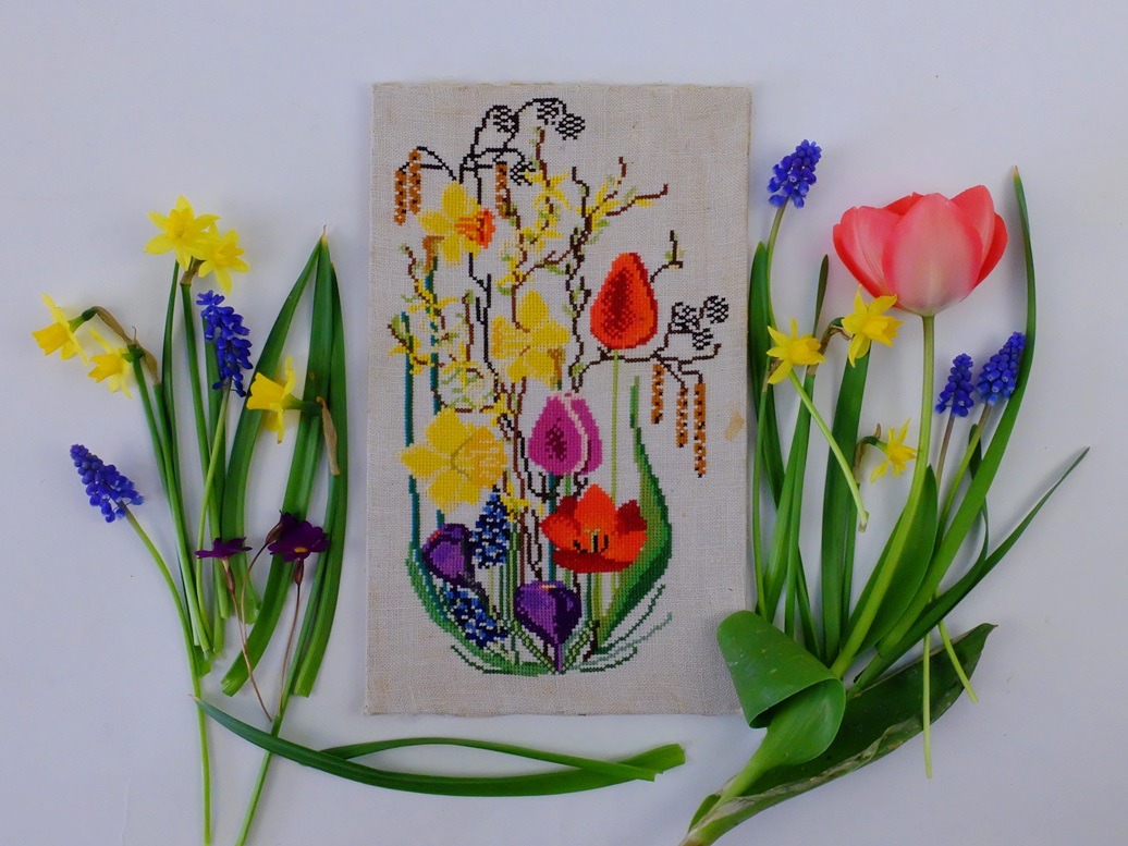 Met deze zojuist gemaakte foto van mijn oude geborduurde voorjaarsbloemen en vers geplukte bloemen uit eigen tuin, wens ik jullie een mooie zondag toe!