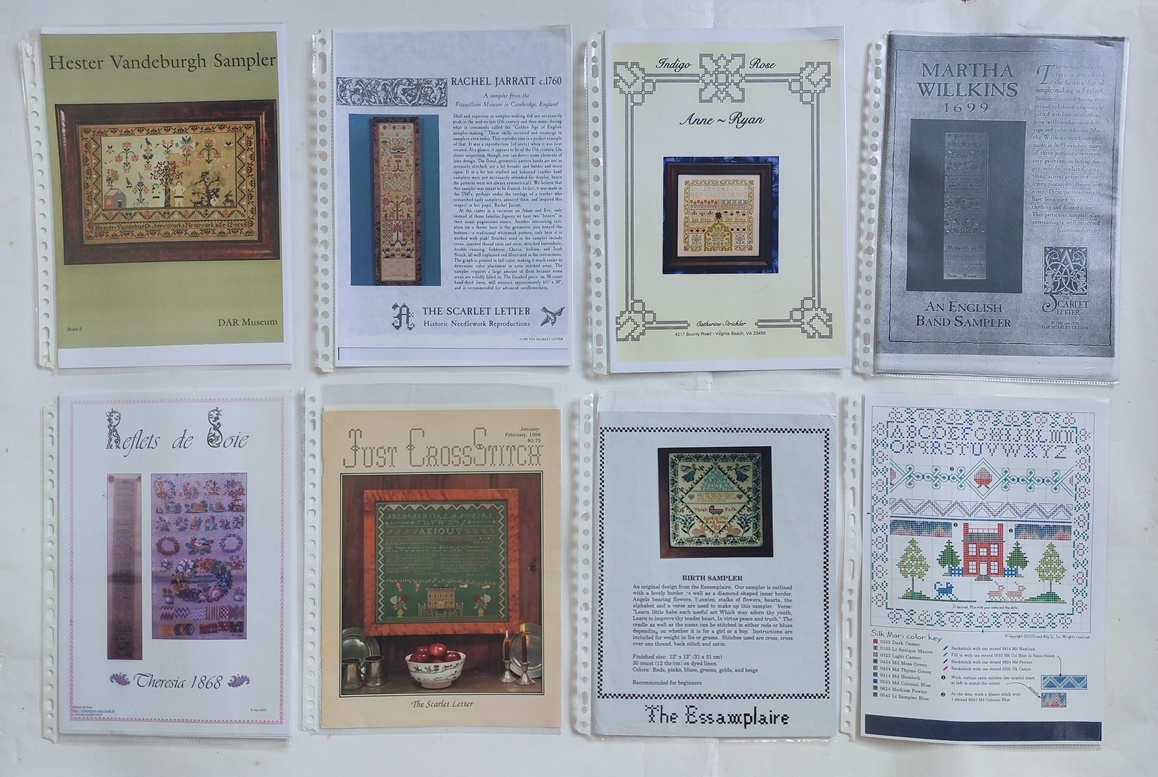 De Engelse merklap-traditie is nog veel rijker en gevarieerder dan de onze. In Engeland werden vroeger bijvoorbeeld band-samplers gemaakt en werden er lappen tekst (letterlijk dus) geborduurd en stonden de alfabetten wat minder centraal. Veel rijk geborduurde oude merklappen zijn er bewaard gebleven en er zijn ook veel patronen van gemaakt. Ik heb er een flinke stapel van en al die patronen staan niet allemaal in mijn shop. Maar net als bij een echte vrijmarkt waar je een snelle blik werpt op de handelswaar op de grond of op een kraam, moet je met een snelle blik besluiten of je iets wil hebben of niet. Voor deze patronen op de foto geldt: doe een vrijmarkt bod! Dat kan via contactformulier.