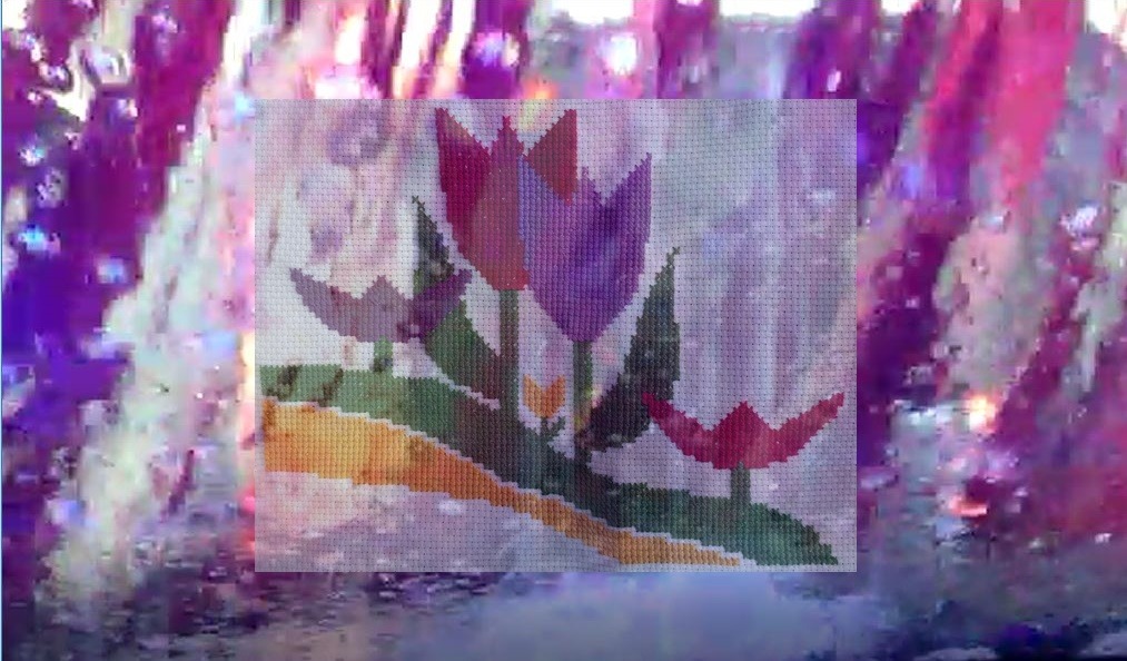 M’n tulpenborduurwerkje fotografeerde ik vorige week nog op een behageld grasveld, en nu is het een week later en beleven we zomerse dagen. Ik maakte er een soort psychedelische kunst van. Omdat we een beetje high worden van deze mooie zonnige dagen.