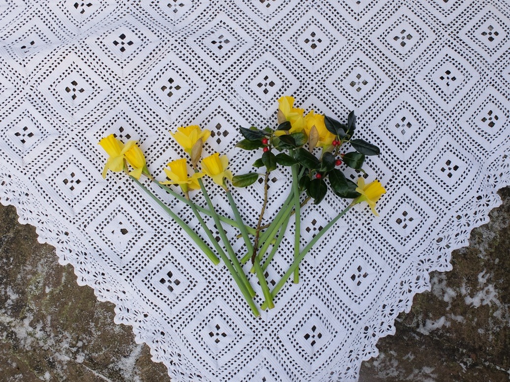 Het is een hele mooie sprei. Een sprei om warm van te worden. Lang geleden gehaakt en nog vele lange jaren bewaard door een kleindochter. Vorig jaar kreeg de sprei een plaatsje in m’n shop en nu is het tijd voor een aanbieding. Een laatste-dag-van-de-maand-aanbieding! Kijk maar in m’n shop als je belangstelling hebt!