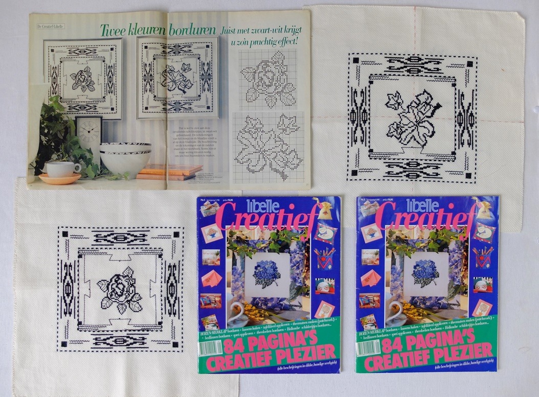 “Juist met zwart-wit krijgt u zo’n prachtig effect” stond als aankondiging in het eerste bewaarnummer Libelle Creatief van 1990. Het effect zit hem vooral in de stilering van het patroon. Deze oude glossy tijdschriften (met nog veel meer mooie borduurpatronen) stonden al in m’n shop. De borduurwerkjes in zwart op wit plaats ik erbij. Leuk om ergens voor te gebruiken zonder het eerst zelf te borduren.