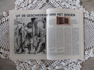 In het degelijke Brei-leerboek van Burda staat ook een mooi artikel over de geschiedenis van het breien. Daarbij ook een afbeelding van het oudst bekende schilderij waarop wordt gebreid. Maria breit op vier pennen een truitje voor het kindeke. Zo dacht men in 1390.