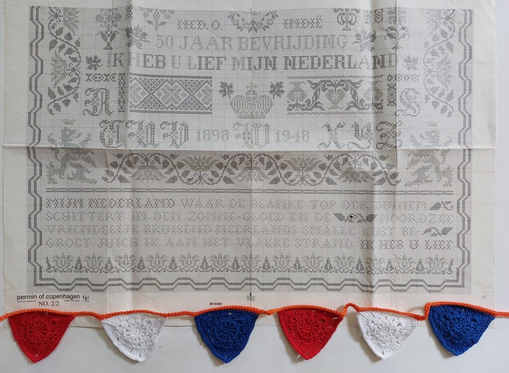 Het lijkt wel of deze 80-jarige vrijheid weer net zo groots is gevierd als vijf jaar geleden bij 75 jaar, en bij de nog eerdere herdenkingen. De herdenking van 50 jaar kan ik me ook nog goed herinneren. Onze kinderen zaten toen op de basisschool en we gingen met hen allerlei dorpjes in Noord-Holland langs, waar overal presentaties waren over de plaatselijke oorlogsgeschiedenis. Dat maakte veel indruk. Uit die tijd stamt ook dit patroon, wat ik nu in mijn shop plaats. Mijn moeder, dochter van een schoolmeester, zong af en toe dat lied over de Blanke Top der Duinen, die zo mooi schitteren in de Zonnegloed. “Ik heb u lief, mijn Nederland”. Bij mijn oma hing het bord over Herrijzend Nederland in de gang, later kreeg ik het. Eenzelfde bord zag ik ook in die vitrine. Zo is deze herdenking รณรณk een beetje de herdenking van hoe onze ouders en grootouders de oorlog herdachten. De bekers, blikjes en bordjes die zij koesterden, de liedjes die ze bleven zingen.