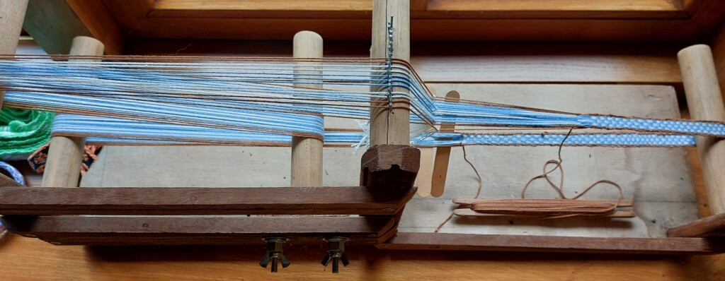Vaak zijn het boeken die specifieke aspecten van het weven bespreken en doorgeven, en daarmee anderen die geboeid zijn door die techniek weer verder helpen. In deze collage een groot aantal buitenlandse boeken over de kunst van het weven. Sommige boeken zijn heel specifiek, bijvoorbeeld met instructies over hoe je moet weven op een Rigid Heddle Frame Loom, of een Backstrap Floor Loom. Anderen boeken gaan over het bandweven, wat de laatste jaren een come-back maakte, en wat in Nederland ook altijd is gedaan. Hieronder een foto van een ‘inkle loom’, die in een recent bezocht openluchtmusuem staat. Smalle geweven bandjes hebben in veel culturen een rol gespeeld in de kleding.